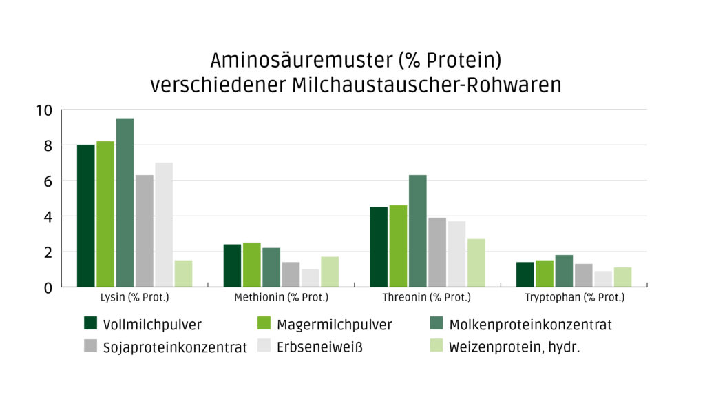 Für die Herstellung von Kälbermilch werden verschiedene Proteinquellen eingesetzt, die sich teils deutlich im Aminosäuremuster unterscheiden.