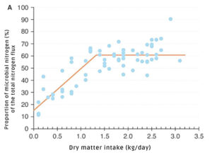 Figure 1: Changes in microbial nitrogen flux in the gut, shown as a percentage (%) of total nitrogen. Source: NASEM (2021), Nutrient Requirements of Dairy Cattle.