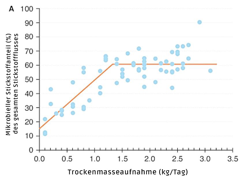 Abbildung 1: Veränderung des mikrobiellen Stickstoffflusses in den Darm, dargestellt als Anteil (%) am Gesamtstickstoff. Quelle: NASEM (2021), Nährstoffbedarf von Milchrindern.